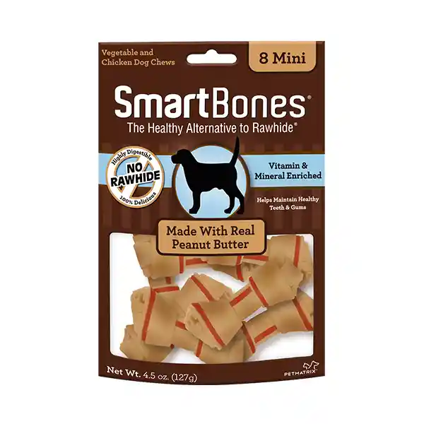 Masticables de hueso clásico de mantequilla de maníSmartBones® tiene todos los beneficios de un masticable de cuero crudo… ¡SIN EL CUERO CRUDO! ¡Los SmartBones® SIN CUERO CRUDO están hechos con MANTEQUILLA DE MANÍ REAL, POLLO y VERDURAS saludables para un sabor delicioso que los perros no pueden resistir!Hecho con auténtica mantequilla de maní, pollo y verdurasSin cuero crudoFácil de digerirEnriquecido con vitaminas y mineralesMasticar ayuda a mantener los dientes sanos
