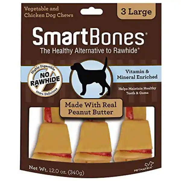 Con 3 Unidades. Tiene Todos Los Beneficios de un Masticable de Cuero Crudo. ¡Sin El Cuero Crudo! Están hechos con Mantequilla de Maní, Pollo y Vegetales. Fácil de digerir , enriquecidos con Vitaminas, Minerales y alto contenido en proteína.