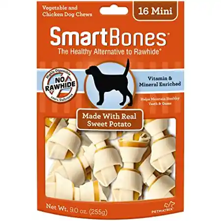Con 16 Unidades. Smartbones® Tiene Todos Los Beneficios de un Masticable de Cuero Crudo… ¡Sin El Cuero Crudo! Sin Cuero Crudo Smartbones® Están Hechos Con Patatas Dulces Reales; Pollo y Otras Verduras Saludables Para un Sabor Delicioso Que Los Perros no Pueden Resistir.