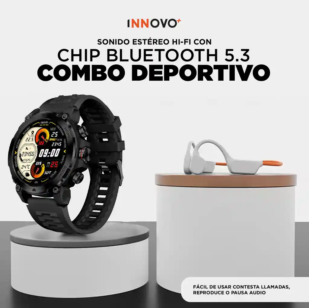 ¡Lleva tu Rendimiento al Límite con el Combo Explorer de INNOVO+! ¿Buscas el equipo definitivo para tus entrenamientos y aventuras al aire libre? El Combo Explorer une la potencia del Smartwatch AuraFit Explorer y la comodidad revolucionaria de los audífonos AuraFit G7. Diseñados para quienes no se detienen ante nada. [BENEFICIOS CLAVE – SMARTWATCH] Smartwatch AuraFit Explorer: Tu Asistente de Elite en la Muñeca No es solo un reloj, es un centro de comando diseñado para resistir. Pantalla AMOLED de 1.43″: Colores vibrantes y nitidez absoluta, incluso bajo el sol directo. Inteligencia Artificial Integrada: Interactúa con ChatGPT y usa comandos de voz para optimizar tu día. Conexión Total: Realiza y contesta llamadas directamente desde tu reloj. Resistencia Extrema IP68: Totalmente sumergible y resistente al polvo. Ideal para natación, senderismo o entrenamientos bajo la lluvia. Sensor de Movimiento Pro: La pantalla se enciende automáticamente al girar la muñeca. [BENEFICIOS CLAVE – AUDÍFONOS] Audífonos AuraFit G7: Sonido Hi-Fi sin Desconectarte del Mundo Gracias a su tecnología de conducción ósea, disfrutarás de tu música favorita manteniendo tus oídos libres para percibir el entorno (ideal para ciclistas y corredores). Chip Bluetooth 5.3: Conexión ultra estable y rápida sin interrupciones. Estabilidad Garantizada: Su ajuste ergonómico asegura que no se caigan, sin importar qué tan intensa sea tu rutina. Sonido Estéreo Hi-Fi: Calidad de audio premium con bajos definidos. Control Táctil: Pausa, reproduce y contesta llamadas con un solo toque.