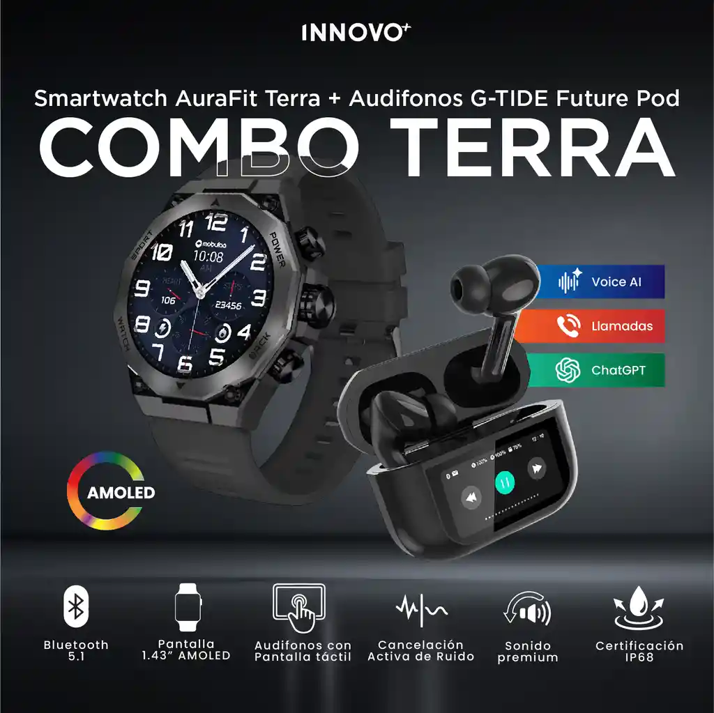 ¡Lleva el futuro en tu muñeca y en tus oídos! Descubre el Combo Terra: Tecnología de Élite para tu Estilo de Vida. ¿Buscas el equilibrio perfecto entre resistencia, elegancia y la última tecnología en Inteligencia Artificial? El Combo Terra no es solo un pack de dispositivos; es tu nuevo centro de comando personal. [POR QUÉ ELEGIR ESTE COMBO] Este dúo dinámico une el potente Smartwatch AuraFit Terra con los revolucionarios Audífonos G-TIDE Future Pod. Ya sea que estés entrenando a máxima intensidad, en una reunión de negocios o simplemente disfrutando de tu música, tendrás lo mejor de la tecnología a tu alcance. Lo que hace a este combo IRRESISTIBLE: Smartwatch AuraFit Terra: El Tanque de Cristal Pantalla AMOLED de 1.43″: Colores vibrantes y negros profundos con una nitidez impresionante, incluso bajo el sol. Resistencia Extrema IP68: Olvídate de preocuparte por el agua o el polvo. Diseñado para durar. +100 Modos Deportivos: El compañero ideal para fitness. Monitorea cada caloría y cada paso con precisión profesional. Estilo Robusto y Elegante: Un diseño que impone presencia en cualquier lugar. Audífonos G-TIDE Future Pod: Más que solo sonido Estuche con Pantalla Táctil Inteligente: Controla tu música, revisa la batería y ajusta configuraciones sin tocar tu celular. Integración con ChatGPT y Voice AI: Accede a asistencia por inteligencia artificial directamente desde tus audífonos. Cancelación Activa de Ruido (ANC): Bloquea el mundo exterior y sumérgete en un sonido HiFi de alta definición. Sonido Premium: Bajos profundos y agudos cristalinos para una experiencia auditiva superior.