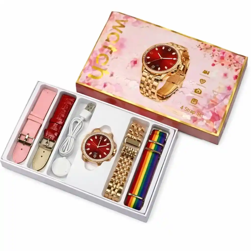 Smartwatch Gen 9 Pulso Metalico dorado + silicona rosado + sintetico cuero rojo + strech multicolor
