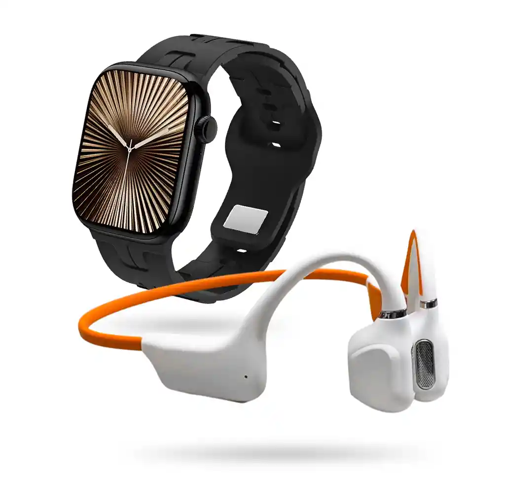 ¿Cansado de que los audífonos se te caigan mientras corres o de no poder controlar tu progreso fácilmente? Eleva tu rendimiento con el Combo Deportivo Premium, diseñado para deportistas exigentes que no comprometen ni el estilo ni la funcionalidad. Audífonos de Conducción Ósea: Libertad y Sonido Hi-Fi Nuestros audífonos no solo suenan increíble, sino que están diseñados para tu seguridad y comodidad: Estabilidad Garantizada: Su ajuste ergonómico se mantiene firme incluso en las rutinas más intensas. ¡Olvídate de reajustarlos! Resistencia IP67 Waterproof: Ideales para sudar al máximo o incluso para nadar. El agua ya no es una excusa. Tecnología Bluetooth 5.0: Conexión estable y rápida con sonido estéreo de alta fidelidad. Control Total: Contesta llamadas, reproduce o pausa tu música favorita con un solo toque. Smartwatch Pro: Tu Asistente en la Muñeca Un reloj que entiende tu ritmo: Modo Deporte Avanzado: Registra cada movimiento y optimiza tus rutinas. Sensor de Movimiento Inteligente: La pantalla se enciende automáticamente al girar la mano, dándote la información que necesitas al instante. Diseño Ergonómico y Moderno: Pantalla de 4cm x 3.5cm que luce perfecta tanto en el gimnasio como en la oficina.