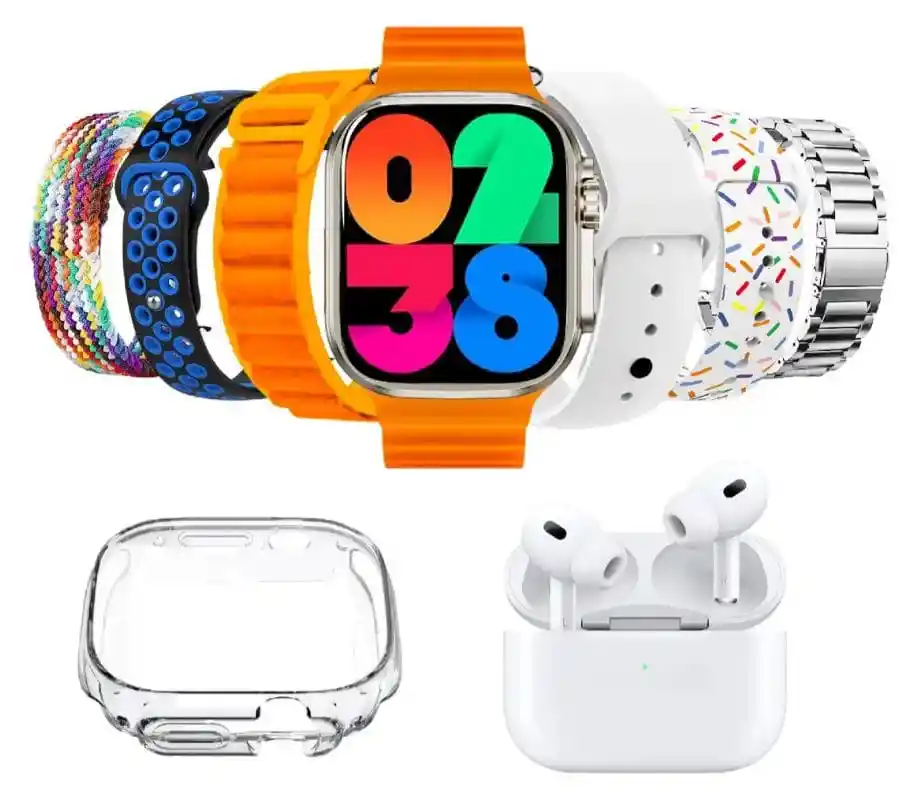 ¿No te decides por un solo color? ¡Llévalos todos! Con el nuevo Smartwatch i20 Ultra 3 Max Suit, no solo obtienes el reloj inteligente más avanzado del mercado, sino una colección completa de 7 pulsos intercambiables para que combine con tu outfit del día, desde el gimnasio hasta una reunión importante. ¿POR QUÉ ESTE COMBO ES PARA TI? Pantalla Infinita de 2.3": Colores vibrantes y alta resolución para ver tus notificaciones y salud con total claridad. 7 Estilos en 1 Solo Reloj: Incluye correas de silicona, tela tejida, metálica y estilo deportivo. ¡Es como tener 7 relojes diferentes! Audio Premium: Disfruta de tus Airpods Pro de 5ta Generación incluidos, con cancelación de ruido y sonido estéreo envolvente. Modo Deporte Avanzado: Registra cada movimiento, ritmo cardíaco y pasos con sensores de alta precisión (Giroscopio y Compás integrados). Conectividad Total: Compatible con Android e iOS mediante Bluetooth 3.0/5.0. Recibe llamadas y notificaciones al instante. ¿QUÉ INCLUYE TU PAQUETE? Smartwatch i20 Ultra 3 Max (Color Titanio). 7 Pulsos/Correas de diferentes materiales y colores. Audífonos Inalámbricos tipo Airpods con estuche de carga. Funda protectora de silicona transparente (Case). Cable de carga magnética para el reloj. Manual de usuario.