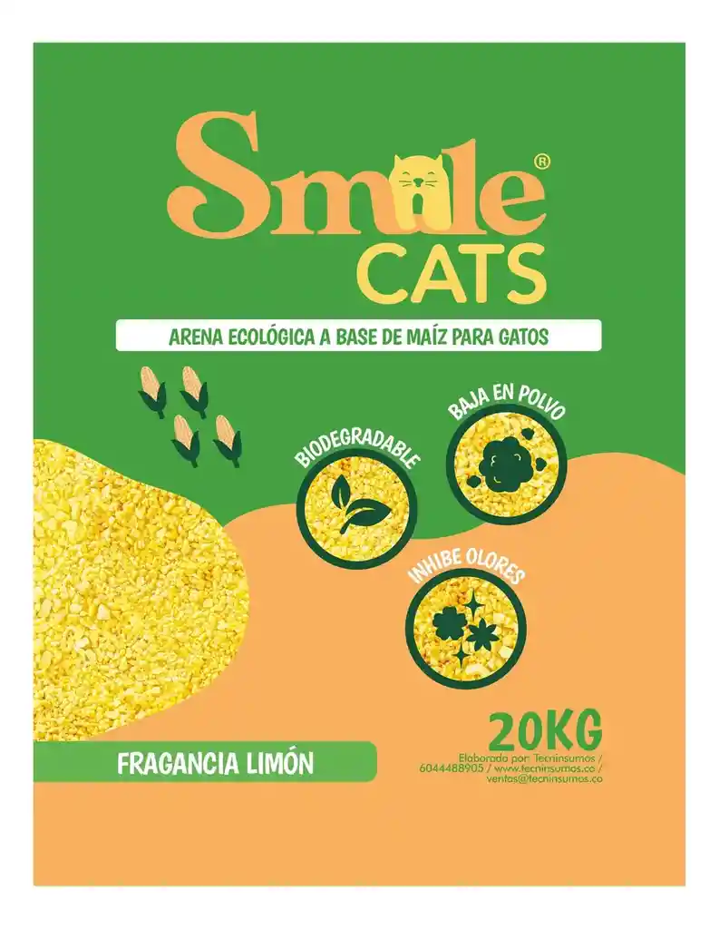 Descubre una experiencia única para tu gato con SmileCats Arena de Maíz con un delicioso aroma a LIMÓN. Esta arena para gatos no solo ofrece un lugar cómodo y suave para su uso, sino que también proporciona un agradable perfume que hará que el cuidado de tu mascota sea aún más agradable. ¡Haz que el momento del aseo sea especial para tu felino con nuestra arena de maíz premium! 1. *Natural y Segura:* Elaborada con maíz, esta arena es una opción natural y segura para tu gato, sin productos químicos agresivos. 2. *Control Efectivo de Olores:* Su fragancia no solo es agradable, sino que también ayuda a controlar de manera efectiva los olores indeseados. 3. *Textura Suave y Cómoda:* La suavidad de la arena proporciona una experiencia cómoda para las patitas sensibles de tu gato, haciéndola ideal para el uso diario. 4. *Biodegradable y Eco-Amigable:* Contribuye al cuidado del medio ambiente, ya que es biodegradable, minimizando el impacto ambiental. 5. *Fácil de Limpiar:* Su textura facilita la limpieza diaria, simplificando la rutina de cuidado de tu gato. 6. *Aroma Duradero:* Disfruta de un aroma duradero, que hará que el espacio de tu mascota se sienta fresco y agradable. Nota: el empaque es un saco blanco con sticker de smile cats limón. El empaque impreso está en proceso. Te garantizamos la calidad del producto