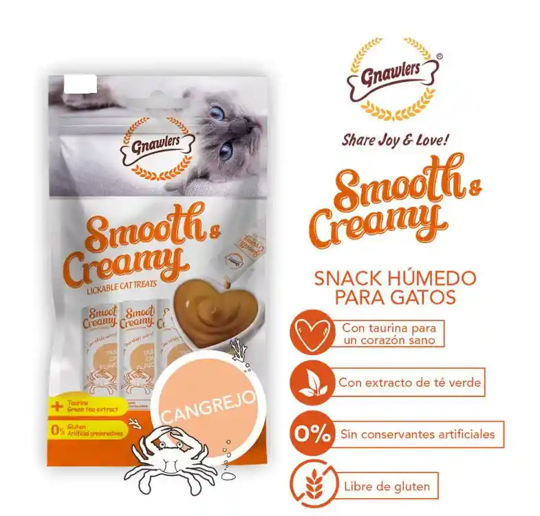 Smooth Cat de Gnawlers es un sabroso premio húmedo y cremoso para su gato adulto. Contiene ingredientes naturales llenos de sabores y proteínas altamente digeribles. Beneficios: - Incluye taurina, para con un corazón más sano. - Libre de gluten. - Con extracto de té verde. - Sin conservantes artificiales. Presentación: Empaque con 4 bolsas individuales de 15 gr.