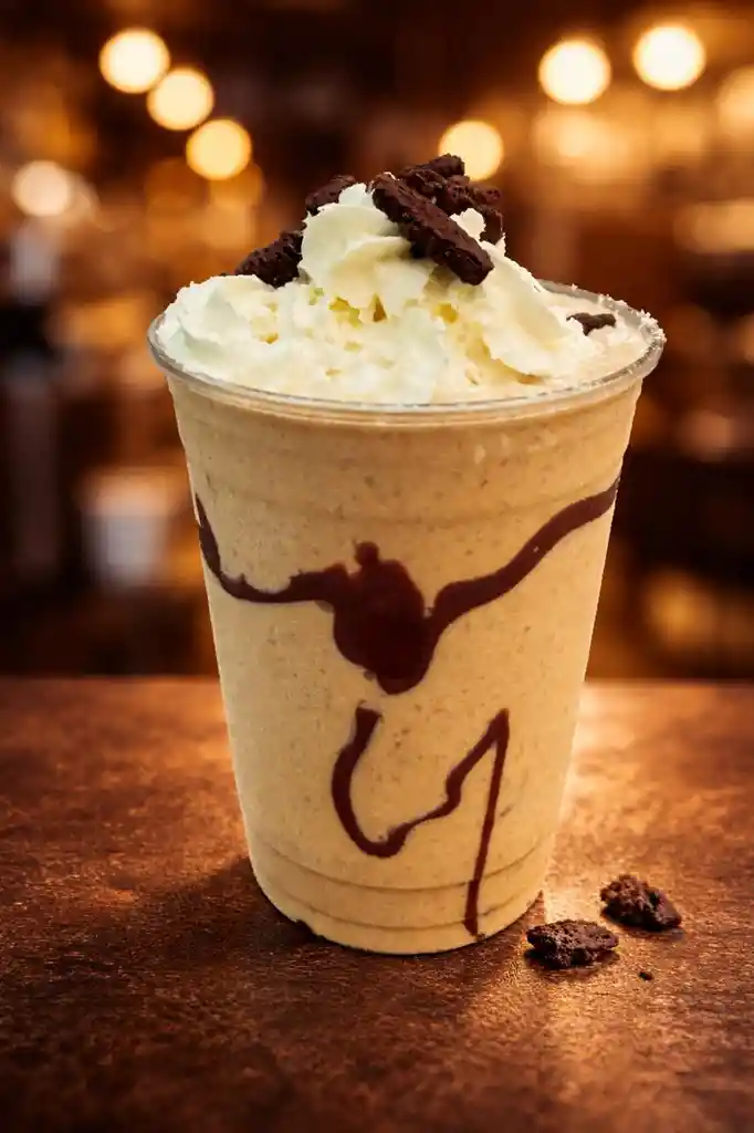 CAFE ESPUMOSO EN VASO DE 16 ONZAS CON CREMA CHANTILLY Y SALSA DE CHOCOLATE DELICIOSO