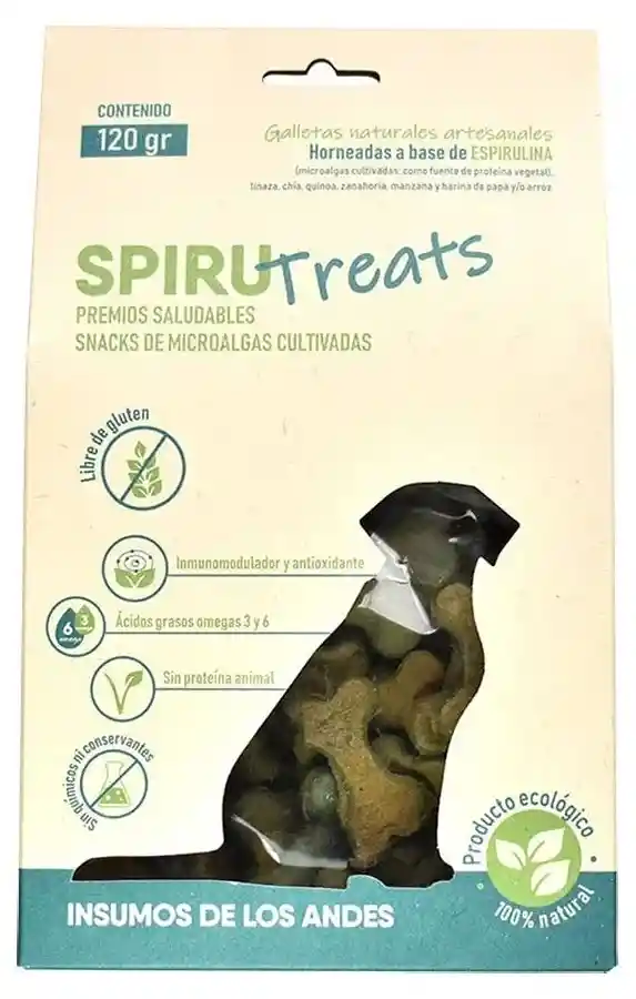 Spiru-Treats es un snack para perros de todas las razas y edades, el cual por sus ingredientes constituye un complemento alimenticio 100% natural y saludable. La espirulina ha sido nominada por la organización mundial de la salud como un superalimento entre otras razones, por su alto contenido de proteína vegetal, hierro y nutrientes esenciales. Premios saludables Snacks de microalgas cultivadas Presentación 120 gr Libre de gluten Inmunomodulador y antioxidante Ácidos grasos omegas 3 y 6 Sin proteína animal Sin químicos ni conservantes Producto ecológico, 100% natural Ingredientes: Espirulina, linaza, quinoa, chía, manzana, zanahoria, harina de papa y/o arroz, pared celular Sacharomyces cerevisae, propionato de calcio, cloruro de colina, vitaminas: A, D3,E,C,K, riboflavina (B2), niacina(B3), acido pantoténico(B5), Piridoxina(B6), Tiamina(B1), Cobalamina (B12), biotina(B7), ácido fólico(B9), Minerales: Zinc, Manganeso, Cobre, Hierro, Yodo, Selenio.
