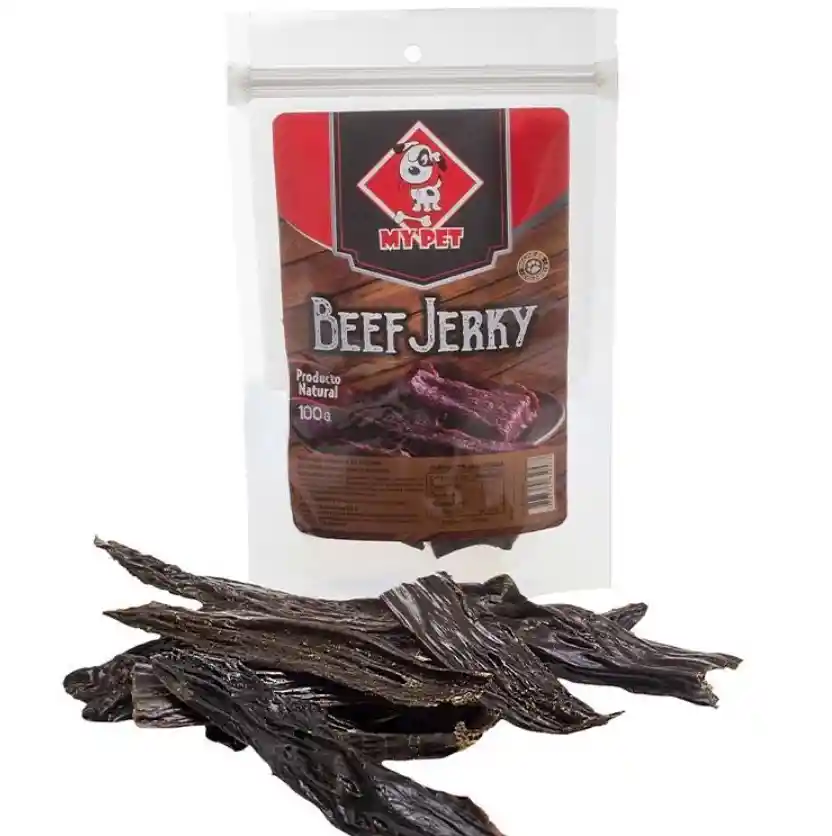 BEEF JERKY Son Trozos de carne de cerdo o res deshidratados, que no contiene carnaza, químicos, ni aditivos, producto 100% natural. - Apto para perros de todas las razas. -Ideal para complementar la alimentación diaria de tu perro. - Se pueden suministrar para premiarlos en su entrenamiento y entretenerlos por horas. - Producto de tamaño mediano, muy crocantes y fáciles de masticar, recomendado para cualquier tamaño de perro. *El paquete incluye varios trozos de carne.
