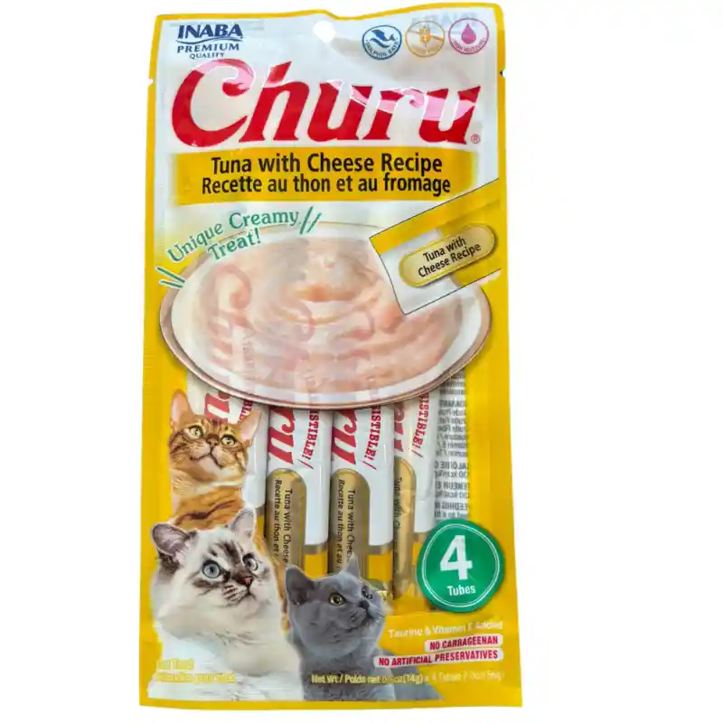 CHURU es un sabroso snack natural, muy saludable y diseñado para dar de comer a los gatos directamente desde el stick verterlo en un plato o añadirlo por encima de los alimentos. Ideales para tomar junto a medicamentos o entretenerlos mientras los bañamos, motilamos, cortamos las uñas, etc. Snack cremoso para Gatos Sabor Atún con Queso (Tuna With Cheese Recipe) x 4 Unidades elaborado con ingredientes de grado humano. Libre de granos, colorantes y preservantes artificiales. Fortalecido con Vitamina E y té verde.