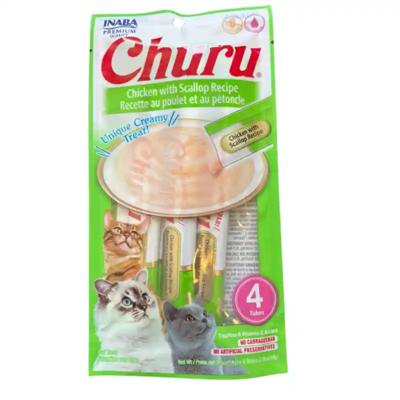 CHURU es un sabroso snack natural, muy saludable y diseñado para dar de comer a los gatos directamente desde el stick verterlo en un plato o añadirlo por encima de los alimentos. Ideales para tomar junto a medicamentos o entretenerlos mientras los bañamos, motilamos, cortamos las uñas, etc. Snack cremoso para Gatos Sabor Pollo Y Vieiras (chicken With Scallops Recipe) x 4 Unidades elaborado con ingredientes de grado humano. Libre de granos, colorantes y preservantes artificiales. Fortalecido con Vitamina E y té verde.