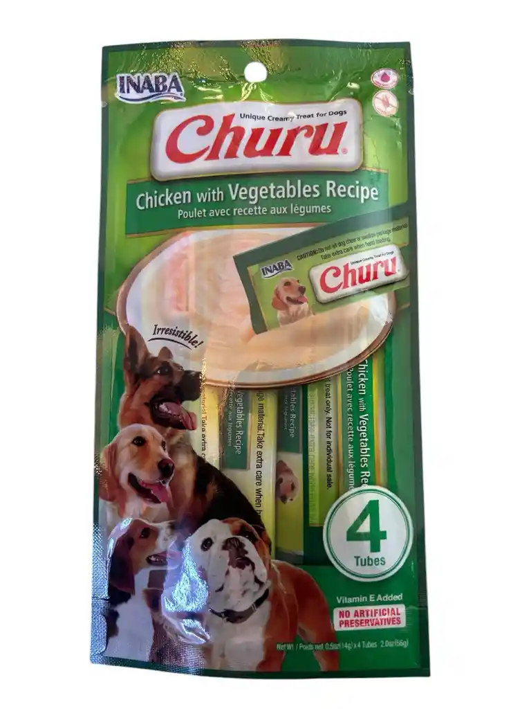 CHURU es un sabroso snack natural, muy saludable y diseñado para dar de comer a los perros directamente desde el stick verterlo en un plato o añadirlo por encima de los alimentos. Ideales para tomar junto a medicamentos o entretenerlos mientras los bañamos, motilamos, cortamos las uñas, etc. Snack cremoso para Perros Sabor Pollo Y Vegetales (chicken With Vegetables Recipe) x 4 Unidades elaborado con ingredientes de grado humano. Libre de granos, colorantes y preservantes artificiales. Fortalecido con Vitamina E y té verde.