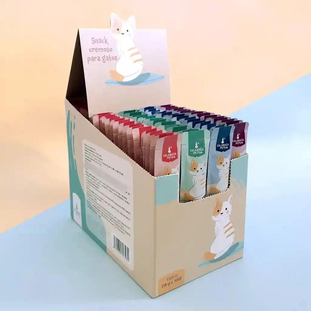 Caja x 100 sachets, sabores surtidos Textura cremosa fácil de lamer. Ayuda a la digestión gracias a la calabaza y prebióticos. Alto contenido de humedad, útil para hidratación. Bajo en grasa y calorías. Características comunes: Sin cereales y sin colorantes artificiales Puede usarse como premio, para estimular el apetito o para mezclar con medicamentos. Presentación: caja x 100 uni En pocas palabras: es un premio cremoso para gatos que aporta sabor, hidratación y apoyo digestivo, pero no reemplaza el alimento principal.