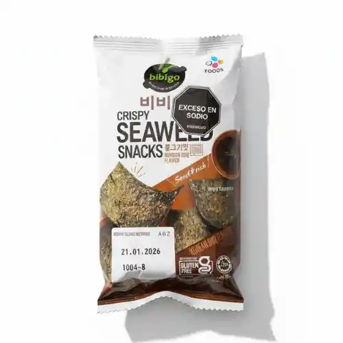 Crujientes láminas de alga marina tostada con el característico sabor dulce y ahumado del BBQ coreano. Un snack ligero, salado y lleno de sabor, ideal para disfrutar solo o como acompañante de comidas asiáticas. Perfecto para quienes aman los sabores intensos y diferentes.