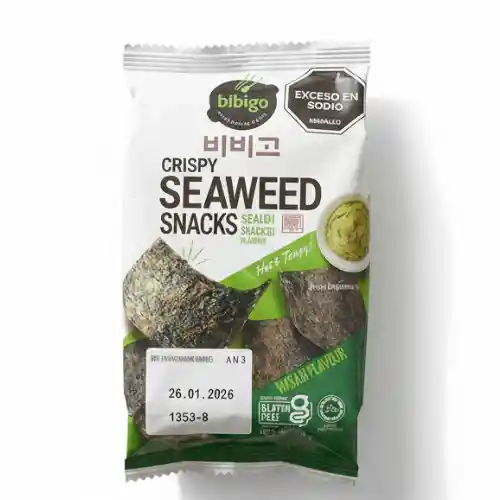 Crujientes láminas de alga marina tostada con un intenso y delicioso toque de wasabi. Un snack ligero, salado y lleno de sabor, ideal para disfrutar solo o acompañar tus comidas asiáticas. Perfecto para quienes aman los sabores intensos y diferentes.