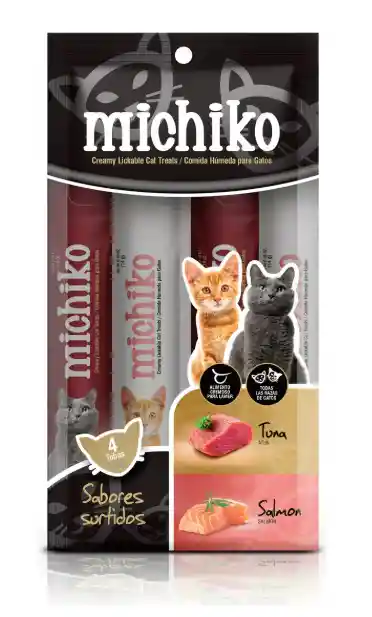 Michiko sachets Atún es un suplemento alimenticio para suministrar a gatos de todas las edades y razas. Presentación 14g. Recomendación Debe conservarse en lugar seco, fresco y ventilado, lejos del alcance de rayos solares directos. Durante el uso mantener el envase cerrado. Consumir en el plazo de 2 días después de abrir el empaque. Agua, (Salmon / Atún), Espesantes, Extracto de pescado, Vitamina E, Colorantes. Alimentar como un bocado o tratar. Este producto esta diseñado para intermitente o alimento suplementario solamente. Mantener suficiente agua fresca a su mascota.