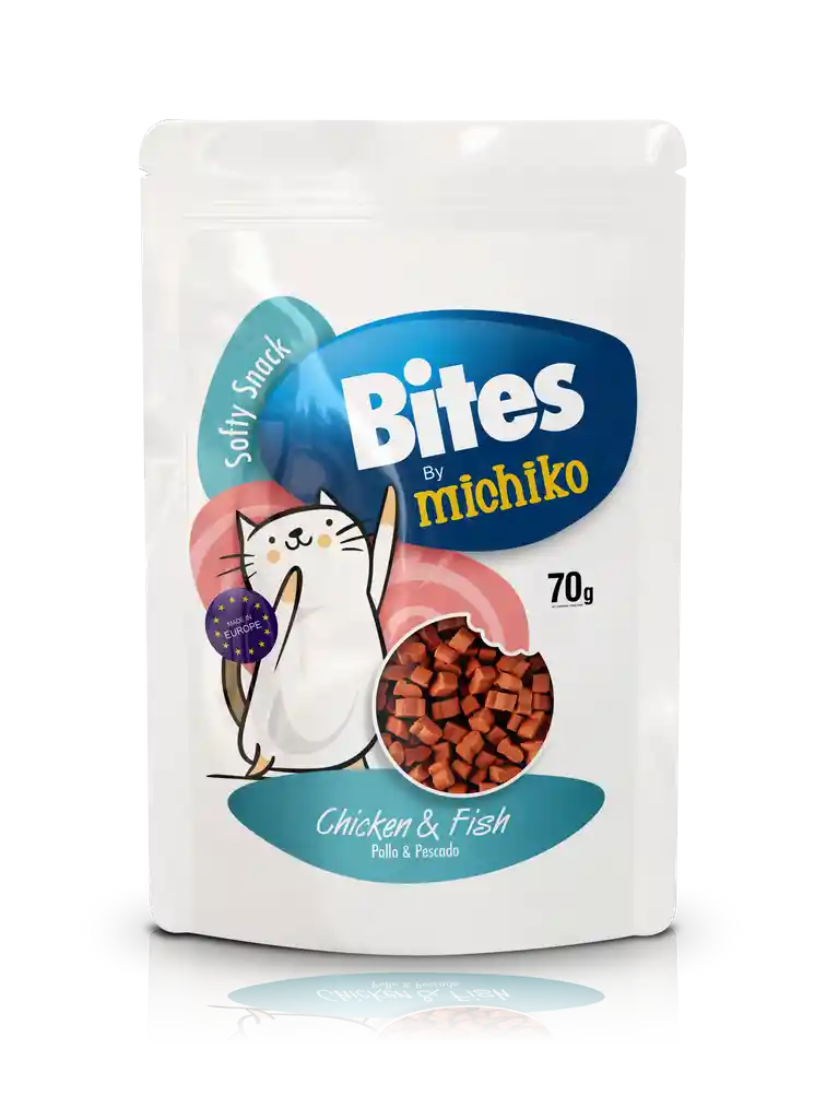 El SNACK PARA GATO MICHIKO BITES 70 Gr - Pollo y Pescado es un premio diseñado especialmente para consentir a los gatos. Tiene una textura suave y fácil de masticar, lo que lo hace adecuado para gatos de todas las edades. Además de ser delicioso, puede usarse como recompensa durante el entrenamiento o simplemente como un capricho diario para fortalecer el vínculo con tu mascota.
