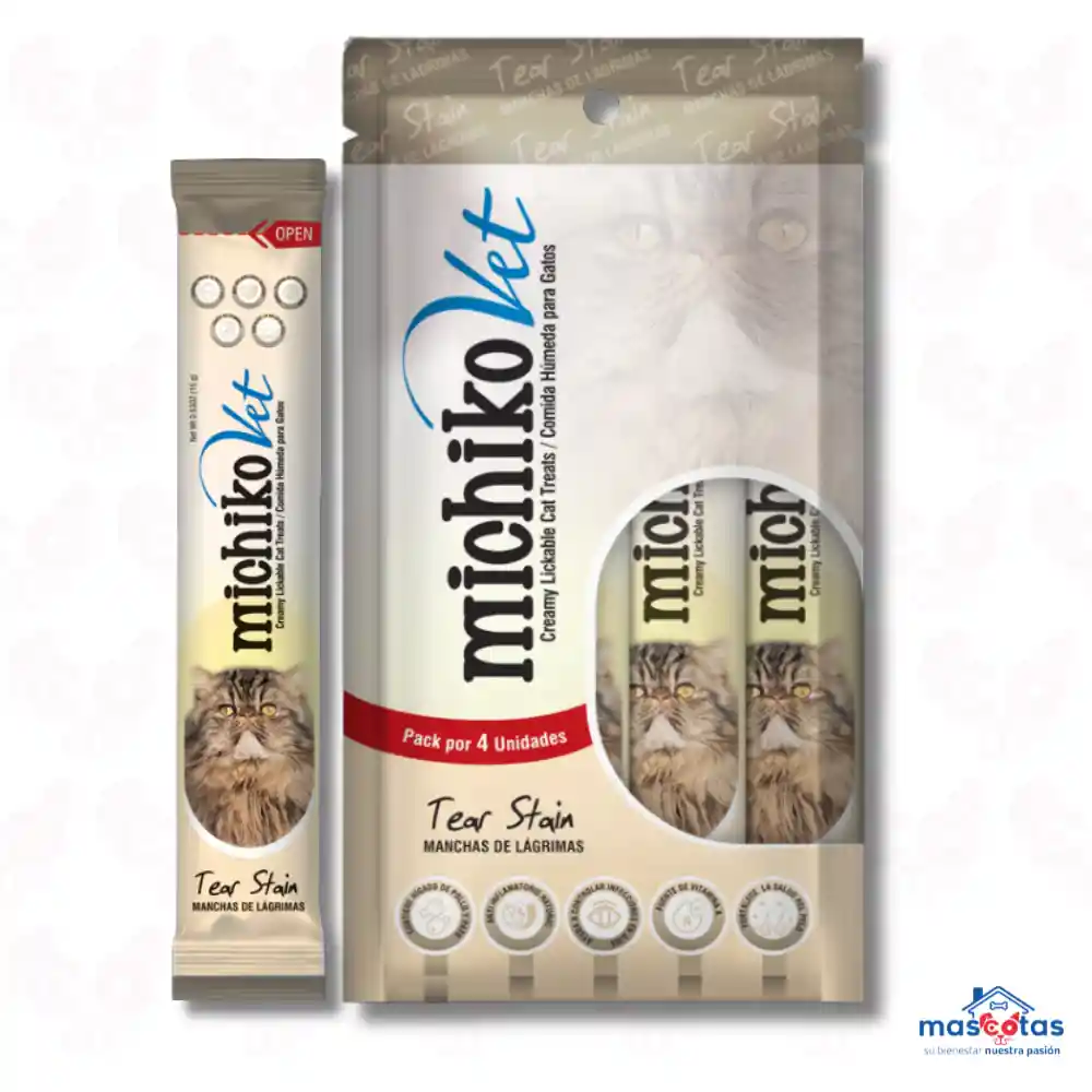 El snack Michiko Vet Tear Stain (Manchas de Lágrimas) es un suplemento funcional y cremoso diseñado para reducir la oxidación de las lágrimas que causa las manchas oscuras debajo de los ojos del gato. Ayuda a promover una piel sana en la zona ocular, siendo un snack ideal para cuidar la estética y salud ocular Función principal: Ayuda a disminuir la coloración oscura o manchas de lágrimas (tear stains). Presentación: Generalmente disponible en sobres (sachets) de 14g, a menudo vendidos en paquetes de 4 unidades. Beneficios adicionales: Promueve una piel saludable y mejora el área alrededor de los ojos. Textura: Cremosa, lo que facilita su administración y mejora la palatabilidad (aceptación) por parte de los gatos. Uso: Complemento alimenticio funcional, no es un alimento principal.