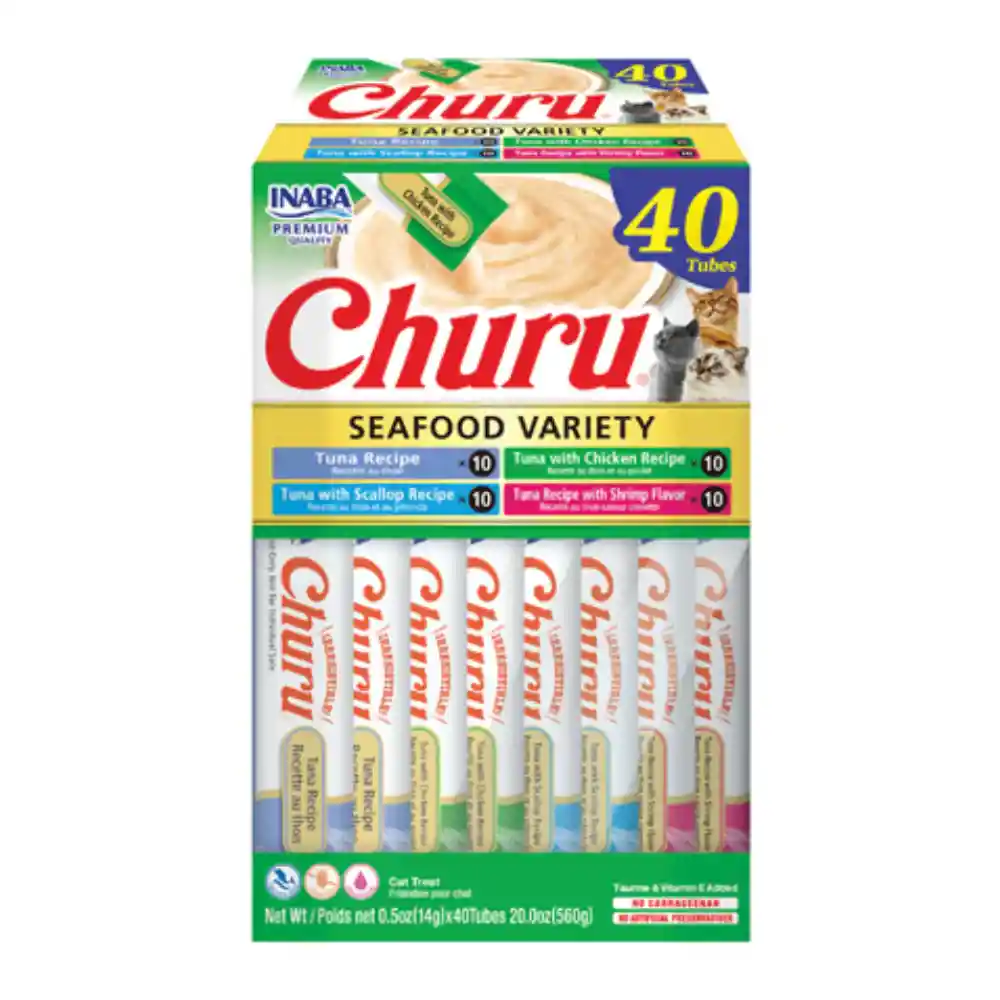 Caja variada de atún y mariscos de 40 churu 40 Tubos, Golosinas Cremosas, Todos los Productos para Gatos HECHO CON INGREDIENTES SALUDABLES EN LOS QUE PUEDE CONFIAR : Cada producto Inaba está elaborado con deliciosos ingredientes de alta calidad, que incluyen pollo criado en granjas y/o atún salvaje natural. MANTENGA A SU FELINO HIDRATADO SIN AÑADIR CALORÍAS: Cada delicioso y cremoso tubo de Churu contiene 91% de humedad y solo seis calorías (una décima parte de las calorías de las golosinas secas tradicionales para gatos), lo que lo convierte en un refrigerio saludable con el que puede sentirse bien al alimentarlo. LIBRE DE COSAS MALAS : Su amigo felino es importante para nosotros, por eso hemos mantenido cosas como granos, conservantes, colorantes artificiales y carragenina fuera de nuestras golosinas para gatos, pero agregamos cosas como taurina para ayudar con su salud general. HAZ QUE COMAN DE TU MANO : Estos tubos de puré de carne para lamer para gatos fueron diseñados para ser alimentados con la mano como una forma interactiva de pasar tiempo con tu felino, pero puedes usarlos como un aderezo para comida húmeda/seca para gatos o como una forma de disfrazar medicamentos. AGREGUE ALGO DE VARIEDAD A LA VIDA DE SU GATO : Disponible en diecinueve sabores sabrosos, los gatos de todas las etapas (desde gatitos hasta adultos mayores) podrán encontrar un sabor que les encante.
