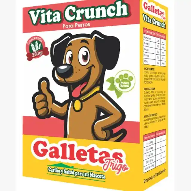 Es un suplemento alimenticio indicado para perros de cualquier edad o raza como complemento de su dieta diaria. Trigo , harina de maíz ,grasa vegetal,azúcar, propionatode calcio, hígado hidrolizado Contenido {Composición|Cantidad} Proteína (Mín)|9% Grasa(Mín)|8% Fibra (Máx)|8% Húmedad (Máx)|12% {Peso Kg Unidades /Día} 1-5.5kg 4 5.5-9 Kg 7 9-22 Kg 10 22- 45Kg 13 Más 45 Kg 16