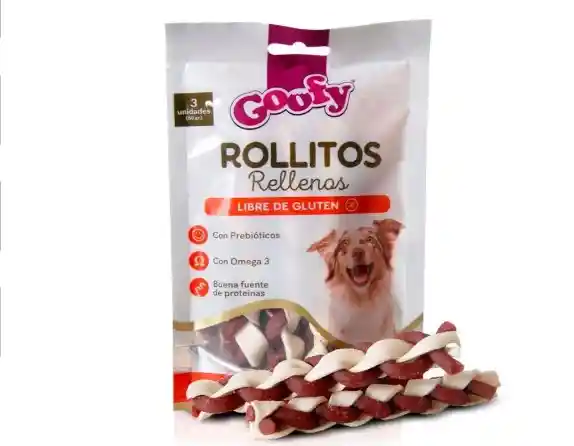 Rollitos Rellenos Goofy son snacks altamente digestibles y 100% libre de gluten para premiar a tu mascota sanamente. Están deliciosamente rellenos y son una excelente forma de regalonear a tu perro con un snack nutritivo y saludable. Altamente digestibles y libres de gluten para premiar a tu perro. Prebióticos para un sistema digestivo sano. Omega 3 para un pelaje sano y brillante. Ayuda a limpiar dientes.