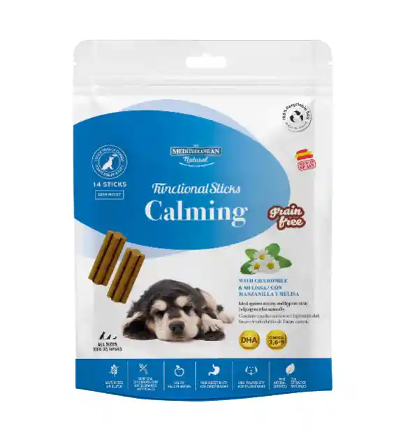 Los Functional Sticks de MEDITERRANEAN NATURAL son un complemento alimenticio elaborado con productos de primera calidad. Se presenta en 6 formatos y cada uno de ellos aporta beneficios específicos para tu perro: Urinary, Salud Bucal, Intestinal, Antiestrés, Piel y Pelo y Articulaciones. Un snack formulado SIN CEREALES, favoreciendo la asimilación de los nutrientes y reduciendo la posibilidad de malestares digestivos. Elaborados con carne y pescado provenientes de la cadena de alimentación humana, los Functional Sticks no contienen cereales, gluten, colorantes artificiales, transgénicos ni ácidos grasos trans y son fuente natural de Omega 9. Es importante destacar que se trata de un complemento alimenticio y no de un medicamento. BUCAL Composición 35% carne de pollo, 20% carne de pavo, glicerina vegetal, harina de garbanzo, 10% jamón serrano, fécula de patata, 4% ascophyllum nodosum, aceite de salmón, zanahoria seca, aceite de girasol, yuca, minerales. Aditivos: Antioxidantes: extractos tocoferoles. Aromatizantes: extracto de romero. Componentes analíticos Proteína: 25.5%, grasa bruta: 9.9%, ceniza bruta: 7.4%, fibra: 1.2%, humedad: 18%, 343 Kcal/100g., omega3: 0.19g/100g; omega6: 1.44g/100g, omega 9: 2.3g/100g. INTESTINAL Composición 21.5% carne de pavo, 18% salmón, 18% atún, glicerina vegetal, harina de garbanzo, 8% prebióticos, 7% jamón serrano, fécula de patata, aceite de salmón, zanahoria seca, aceite de girasol, yuca, minerales. Aditivos: Antioxidantes: extractos tocoferoles. Aromatizantes: extracto de romero Componentes analíticos Proteína: 28.2%, grasa bruta: 7.2%, ceniza bruta: 8.8%, fibra: 2.2%, humedad: 15.2%, 301 Kcal/100g., omega3: 0.27g/100g, omega6: 1.7g/100g, omega 9: 2.4g/100g. PIEL Y PELO Composición 21% salmón, 21% atún, 20% carne de pavo, glicerina vegetal, harina de garbanzo, 7% jamón serrano, fécula de patata, 1% aceite de salmón, zanahoria seca, aceite de girasol, yuca, minerales. Aditivos: Antioxidantes: extractos tocoferoles. Aromatizantes: extracto de romero. Componentes analíticos Proteína: 26.4%, grasa bruta: 8.4%, ceniza bruta: 8.9%, fibra: 1.2%, humedad: 19.8%, 323 Kcal/100g., omega3: 0.7g/100g, omega6: 2.1g/100g, omega 9: 2.8g/100g. CALMING-ANTIESTRES Composición 25% carne de pavo, 19% salmón, 19% atún, glicerina vegetal, harina de garbanzo, 8% jamón serrano, fécula de patata, 1% manzanilla, 1% melisa, zanahoria seca, aceite de girasol, yuca, minerales. Aditivos: Antioxidantes: extractos tocoferoles. Aromatizantes: extracto de romero. Componentes analíticos Proteína: 27.5%, grasa bruta: 8.1%, ceniza bruta: 9.1%, fibra: 1.6%, humedad: 18.6%, 311 Kcal/100g., omega3: 0,27g/100g, omega6: 1.6g/100g; omega 9: 2.3g/100g