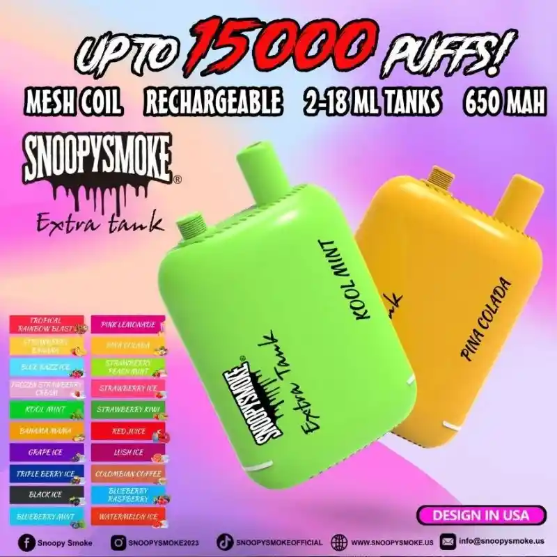 🔥 SNOOPY 15.000 Puffs 🔥 📩 Escríbenos por el chat de Rappi o a nuestro WhatsApp +573024418058 para elegir tu sabor favorito 💬💜 Vape desechable de alto rendimiento con 2 tanques del mismo sabor, para una experiencia más duradera y estable 😮💨✨ Sabor intenso, vapor constante y uso diario sin complicaciones. 🍭 SABORES DISPONIBLES - Pineapple Ice 🍍❄️ - Strawberry Ice 🍓❄️ - Lush Ice 🍉❄️ - Cherry Coke Ice 🍒🥤❄️ - Blueberry Mint 🫐🌿 - Kool Mint 🌿❄️ - Blueberry Raspberry 🫐🍓 - Watermelon Ice 🍉❄️ - Frozen Strawberry Cream 🍓🍦❄️ - Strawberry Peach Mint 🍓🍑🌿 ⚙️ CARACTERÍSTICAS 💨 Hasta 15.000 puffs 🔋 Batería de larga duración 💧 2 tanques del mismo sabor 🔥 Listo para usar