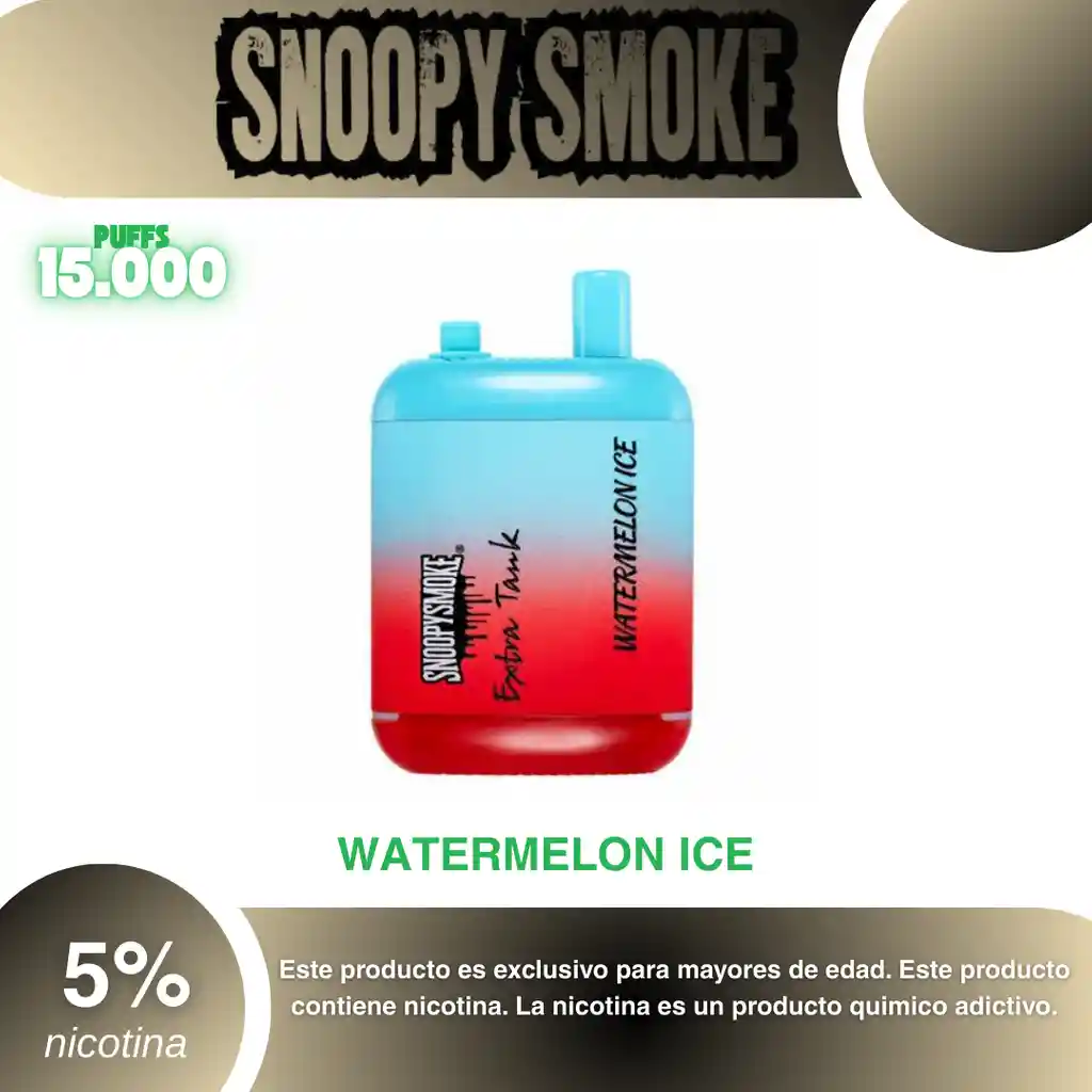Snoopy Smoke Vape 15.000 Puffs, Sabor Sandia Mentolada 5% PROHIBIDA LA VENTA A MENORES DE EDAD. ADVERTENCIA: ESTE PRODUCTO CONTIENE NICOTINA, LA NICOTINA ES UNA SUSTANCIA QUIMICA ADICTIVA Y NOCIVA PARA LA SALUD. Los líquidos para vapeo contienen: propilenglicol USP, glicerina USP, sabor artificial y nicotina. Este producto puede contener nicotina, una sustancia altamente adictiva que puede generar dependencia, posibles afectaciones arteriales, cardiacas, pulmonares y otras aun no identificadas. No se recomienda su uso a mujeres en embarazo, puede generar lesiones al feto. Mantener alejado de niños y mascotas. No ingerir, puede generar irritación y/o intoxicación. Por favor antes de consumir consulte a su médico posibles afectaciones o sensibilidad a alguno de sus componentes. Los componentes de este producto pueden aumentar la sensación de ansiedad En caso de notar alguna reacción adversa por favor suspenda su uso de manera inmediata. Siga las instrucciones en el envase. No alterar sus componentes. Adquiera sus productos en sitios de confianza No use productos piratas, alterados, o en los cuales no pueda comprobar su buena procedencia, Verifique la reputación del fabricante y distribuidor antes de adquirir cualquier producto Si no es usuario fumador o vapeador no se recomienda su uso bajo ninguna circunstancia Al usar este producto usted es consciente que este producto puede generar afectaciones a su salud, incluyendo aquellas que a la fecha de la compra no se han identificado y que pueden aparecer a largo plazo