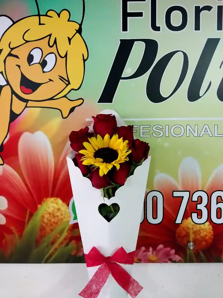 8 unidades de Rosa Roja y 1 Girasol con follajes