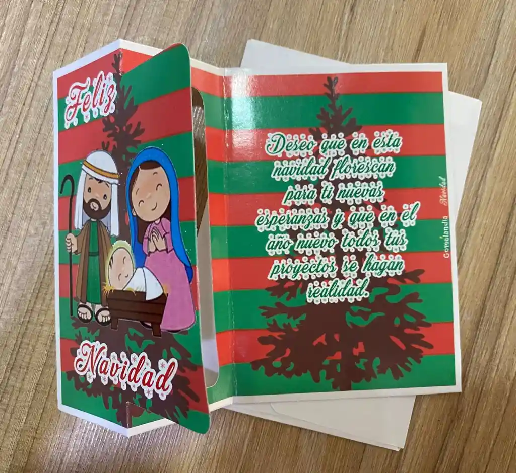 Sobre Tarjeta navideña pequeña con portada y mensaje, contiene sobre en blanco adicional motivos variados.