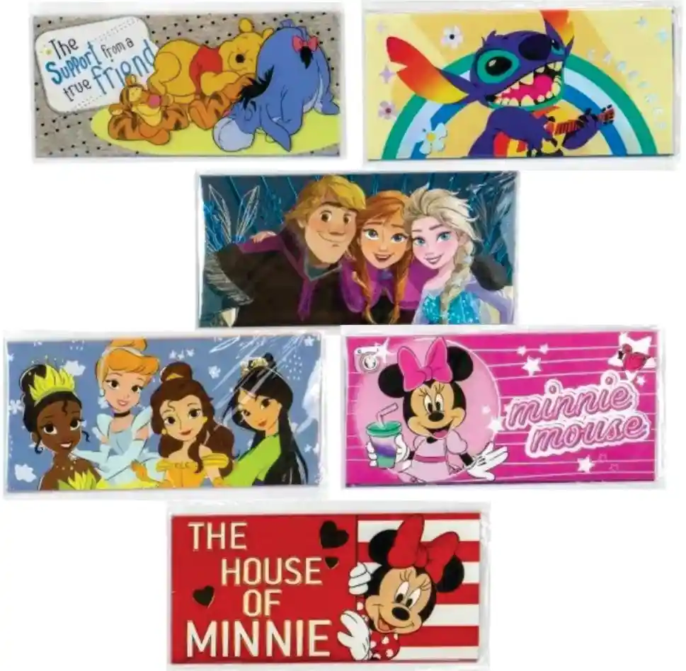 Sobres de regalo temáticos de Disney. Incluyen personajes populares como Minnie Mouse, Stitch, y princesas de Disney. Modelo sujeto a disponibilidad de la tienda. Son adecuados para diversas ocasiones, como fiestas y decoración.