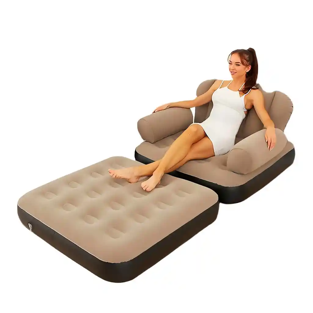 Disfruta de la máxima comodidad y versatilidad con este sofá inflable convertible 2 en 1, diseñado para adaptarse a tus necesidades de descanso en cualquier momento. Fabricado con materiales de alta resistencia y una superficie con acabado tipo terciopelo suave al tacto, este sofá puede transformarse en cuestión de segundos de un cómodo sillón de lectura en una cama individual espaciosa. Su estructura ergonómica incluye un respaldo contorneado y apoyabrazos integrados que brindan un soporte excepcional para la espalda y los brazos, ya sea que estés viendo televisión, estudiando o tomando una siesta. Gracias a su diseño ligero y compacto una vez desinflado, es la solución perfecta para recibir invitados inesperados, llevar de camping o simplemente optimizar el espacio en habitaciones pequeñas y apartamentos. FICHA TÉCNICA DEL PRODUCTO Producto: Sofá inflable convertible 2 en 1 (Sillón y Cama) Material: PVC de alta durabilidad con superficie flocada antideslizante Dimensiones modo sofá: 100 cm (Ancho) x 88 cm (Profundidad) x 90 cm (Alto) Dimensiones modo cama: 100 cm (Ancho) x 188 cm (Largo) x 70 cm (Alto hasta el respaldo) Altura del colchón desplegado: 22 cm Capacidad: 1 persona (Individual) Válvulas: Sistema de inflado y desinflado rápido 2 en 1 Peso soportado: Hasta 100 kg aproximadamente Uso: Interior y exterior (Hogar, camping, jardín) Características adicionales: Respaldo ergonómico, apoyabrazos integrados, fácil de guardar POLÍTICAS DE GARANTÍA El producto cuenta con una garantía de 30 días calendario por defectos de fabricación en las costuras o fallas en las válvulas detectadas al momento del primer inflado. No se aceptarán reclamaciones por pinchazos, cortes o rasgaduras causados por objetos punzantes, quemaduras, sobrepresión por inflado excesivo o uso por encima del límite de peso especificado. Para hacer efectiva la garantía, es indispensable reportar el daño inmediatamente tras recibir el producto y conservarlo en su empaque original sin señales de suciedad o uso inadecuado en superficies ásperas.