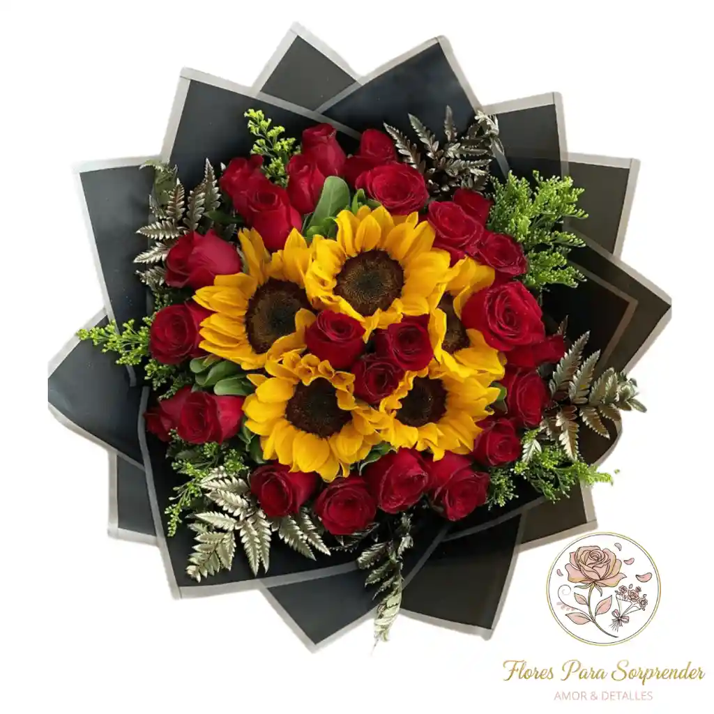 Arreglo floral elaborado con girasoles frescos y rosas rojas de alta calidad, complementado con follaje decorativo y envuelto en un elegante papel negro. La combinación de colores intensos y flores naturales lo convierte en un detalle ideal para regalar en ocasiones especiales como aniversarios, cumpleaños, celebraciones o para expresar amor y admiración. Un diseño moderno, llamativo y cuidadosamente presentado para sorprender desde el primer momento.