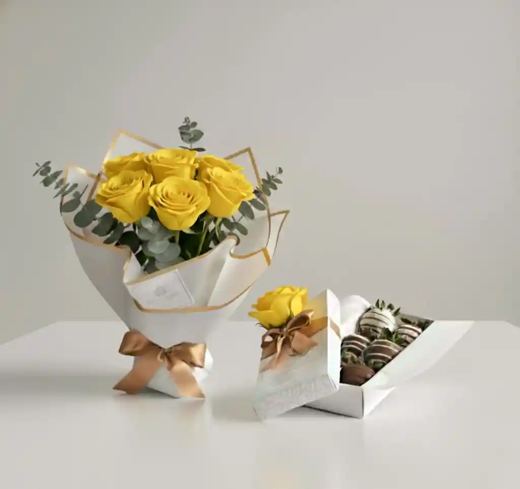 Cuando quieres decir gracias, celebrar una amistad o encender un día gris, el amarillo habla claro. Este set combina un bouquet de rosas amarillas con eucalipto y una caja de fresas con chocolate artesanal en empaque blanco minimal con lazo champagne. Presentación impecable, lista para sorprender hoy en Bogotá. Lo que recibes Bouquet de rosas amarillas frescas x 7 unidades (estilo moderno). 6 Fresas premium bañadas y decoradas a mano. Entrega el mismo día en Bogotá (pedido antes de 5:00 p.m.). Compra fácil y pago seguro desde la web. Personalización disponible: tarjeta con tu mensaje y extras seleccionados. Ideal para: agradecimientos, “pensé en ti”, cumpleaños, pronta recuperación, amistad, Amor y Amistad.