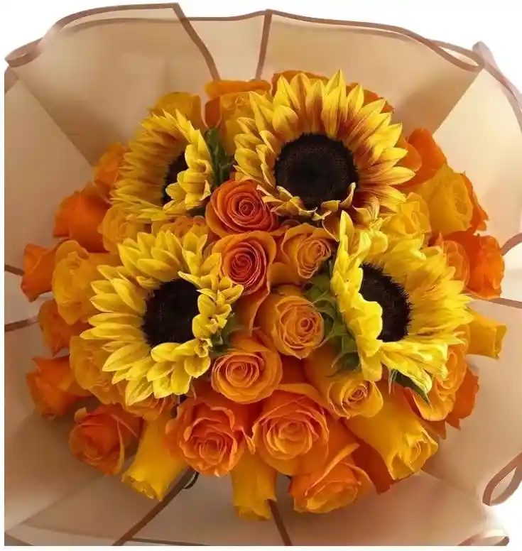 Ramo buchón de 4 girasoles y 40 rosas narajas Nota: La flor puede ser sustituida dependiendo la disponibilidad de color y del producto “Mensaje Personalizado” máximo de 30 caracteres (Dejar el mensaje en el chat, los comentarios no se previsualizan para la tienda por lo que si se dejan allí no podrá ser incluido).