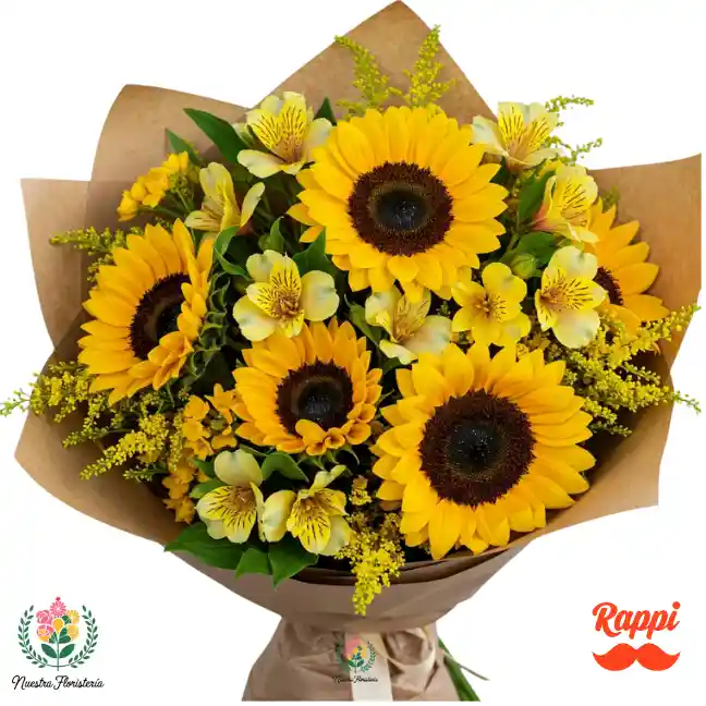 Un vibrante buqué que irradia alegría con seis girasoles imponentes, delicadas astromelias y el toque etéreo del solidago.