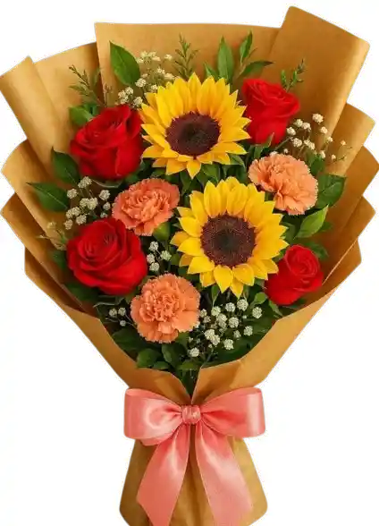 Bouquet vibrante con girasoles, rosas rojas y claveles en tonos cálidos. Una combinación perfecta de alegría, amor y energía positiva. Ideal para sorprender y llenar el día de luz.