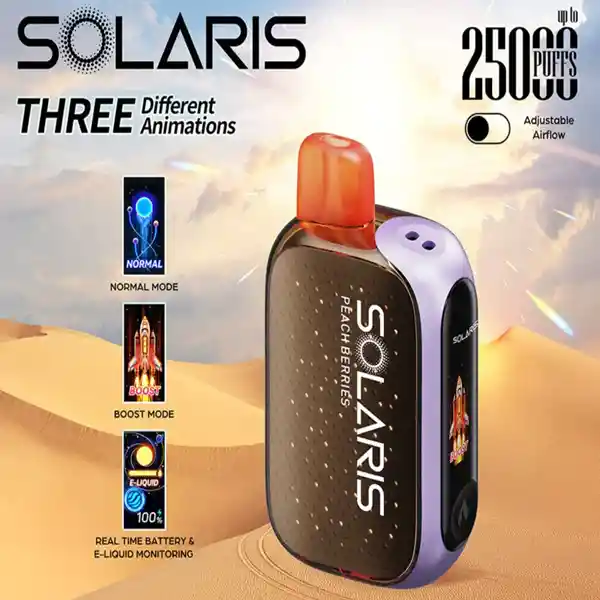 dispositivo que se carga con el sol, y con cable tipo c. modo normal, boost, 25000puffs 5% nicotina