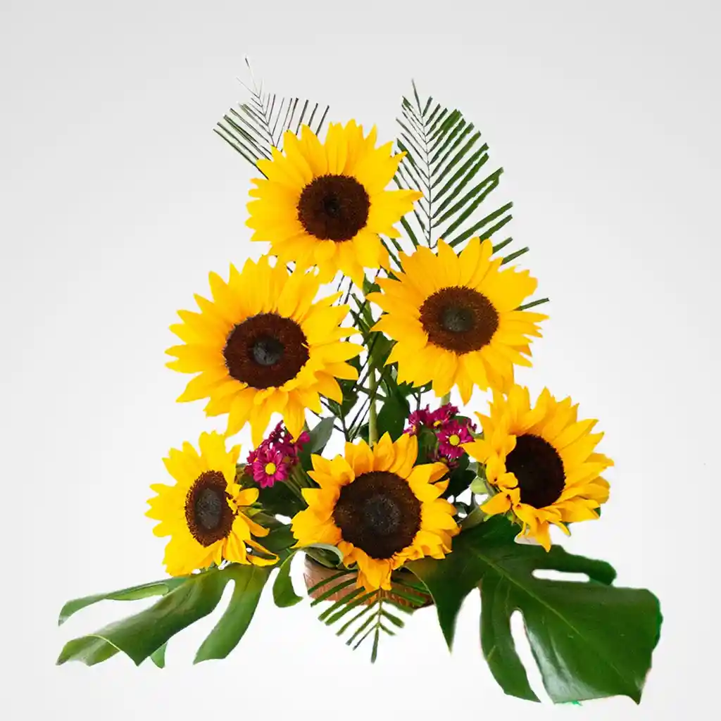 Arreglo floral elaborado con 6 girasoles, coquetas y fresco follaje compuesto de ruscus, balazo y palma moldeada. de color Amarillo ideal para el Agradecimiento