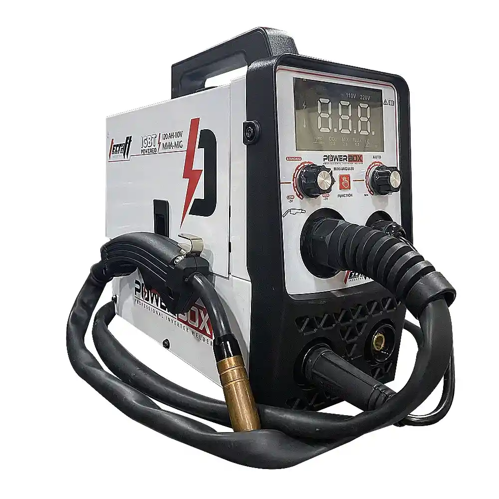 Soldador inversor profesional proceso MMA/TIG LIFT/MIG de 120 amperios con conexión a 110V monofásico marca Tecraft Industry de tecnología alemana. El soldador inversor POWERBOX-MINI-MIG1120 está diseñado para profesionales de la soldadura, es un equipo profesional de excelente rendimiento con potencia para soldar electrodos 6011, 6013, 7018 e inoxidable en grosores de hasta 1/8" (3.2mm) de espesor. Ideal para trabajos en proceso MIG tanto en metal como inoxidable de 0,030 (0,8mm), 0,035 (0,9mm) y 0,040 (1.0mm). Puede trabajar en proceso TIG LIFT (TIG raspado) de manera opcional adicionándole una antorcha TIG de borne 10/25. (Este proceso no es recomendado para trabajar calibres delgados). Este equipo es ideal para trabajos ligeros y profesionales, soldaduras domésticas, talleres de herrería, talleres mecánicos, talleres de carrocería de autos y motocicletas, institutos de enseñanzas, instalaciones y montajes, mantenimiento de medianas estructuras, cerrajerías, mantenimiento y reparación de operaciones del campo, reparaciones menores y demás trabajos profesionales. Cuenta con un diseño ligero y compacto, que permite transportar la máquina con mucha facilidad. Ideal para trabajos en alturas. Simple y fácil de regular. Facilita el inicio del arco precalentando el electrodo. Evita que el electrodo se adhiera a la pieza mientras se está realizando el trabajo. Dimensiones del equipo: 22cm de alto x 31cm de largo x 13,5cm de ancho. Peso del equipo: 5Kg. Capacidad de rollo: 1Kg Ciclo de trabajo: 60%