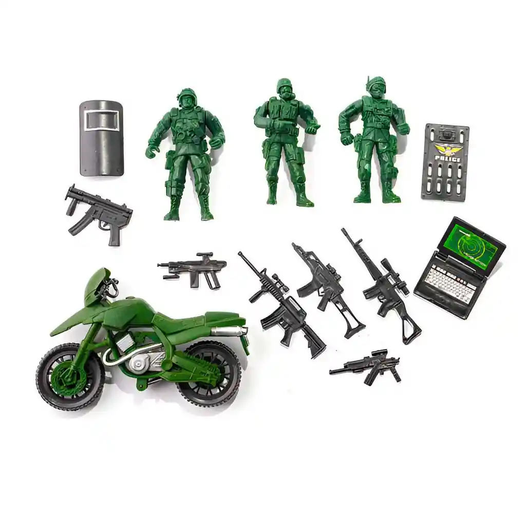 Sumérgete en el mundo de la estrategia y el combate con nuestro set de soldados y sus accesorios. Cada figura está meticulosamente detallada y lista para la acción, con uniformes realistas y poses dinámicas. Los accesorios incluidos, desde armas hasta equipo táctico, añaden un toque auténtico a tus escenas de batalla imaginarias. Ficha Técnica Dimensiones del empaque: (Alto x Ancho ): 18 cm x 19 cm Dimensiones del soldado: (Alto x Ancho): 10 cm x 4 cm Material: Plástico ABS Edad recomendada: 3 años en adelante Referencia: MG21714 Certificado de conformidad: E5-0359-2021 ** _Para defectos de fábrica o retractos: \_Por favor revise el producto apenas lo reciba y antes de usarlo. No aplican ley de retracto o defectos de fábrica luego de usar el producto. Se manejan máximo 5 días para reportar defectos de fábrica (por ejemplo, producto funciona mal, piezas faltantes, rotas, etc). Para hacer efectiva la devolución el producto debe devolverse con el empaque original, el cual debe estar en buen estado, incluir todos los documentos y las partes completas y sin daños.