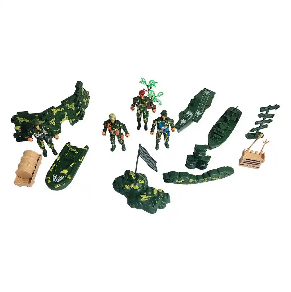 ¡Toma el mando y despliega tus tropas para la misión definitiva con este completo y emocionante set de combate militar! Este increíble paquete te proporciona todo lo necesario para crear un campo de batalla a gran escala, incluyendo un pelotón de soldados articulados listos para la acción, una flota naval con barcos y lanchas de asalto, y múltiples elementos de fortificación como muros y sacos de arena. Perfecto para planificar estrategias, defender el territorio y liderar audaces operaciones por tierra y mar, es el regalo ideal para los pequeños amantes de la acción, garantizando horas de juego imaginativo y aventuras heroicas en un solo lugar. Ficha Técnica Dimensiones del empaque: (Alto x Ancho ): 29 cm x 23 cm Dimensiones del soldado: (Alto x Ancho): 10 cm x 5 cm Material: Plástico ABS Edad recomendada: + 3 años Referencia: JH1294 Certificado de conformidad: E5-0359-2021 ** _Para defectos de fábrica o retractos: \_Por favor revise el producto apenas lo reciba y antes de usarlo. No aplican ley de retracto o defectos de fábrica luego de usar el producto. Se manejan máximo 5 días para reportar defectos de fábrica (por ejemplo, producto funciona mal, piezas faltantes, rotas, etc). Para hacer efectiva la devolución el producto debe devolverse con el empaque original, el cual debe estar en buen estado, incluir todos los documentos y las partes completas y sin daños.