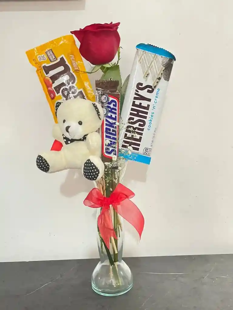 Lindo arreglo de Flor con peluche y variedad de chocolates