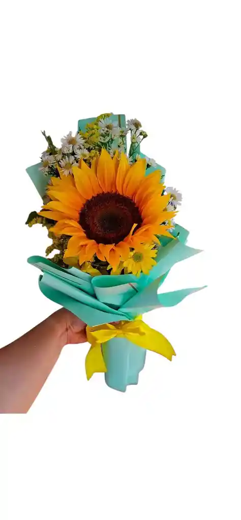 Solitario de girasol acompañado de follaje envuelto en papel coreano más un lazo