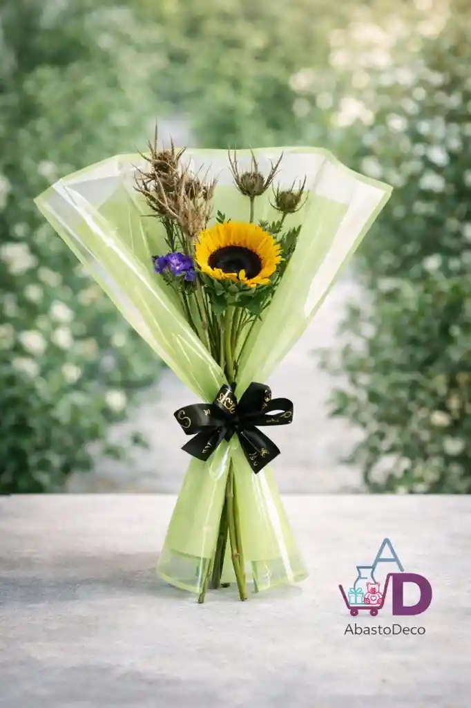 Hermoso Girasol decorado en papel de lujo, follaje tratado, y moño...... Flores amarillas, bienvenida de la primavera.