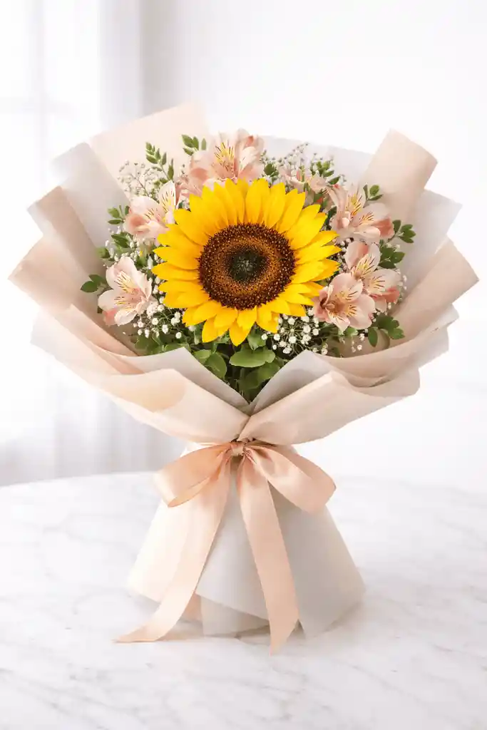 Hermoso Solitario de Girasol con astromelias en empaque coreano. Incluye tarjeta con mensaje personalizado Nota: La envoltura puede variar según disponibilidad al igual que el color de las astromelias.