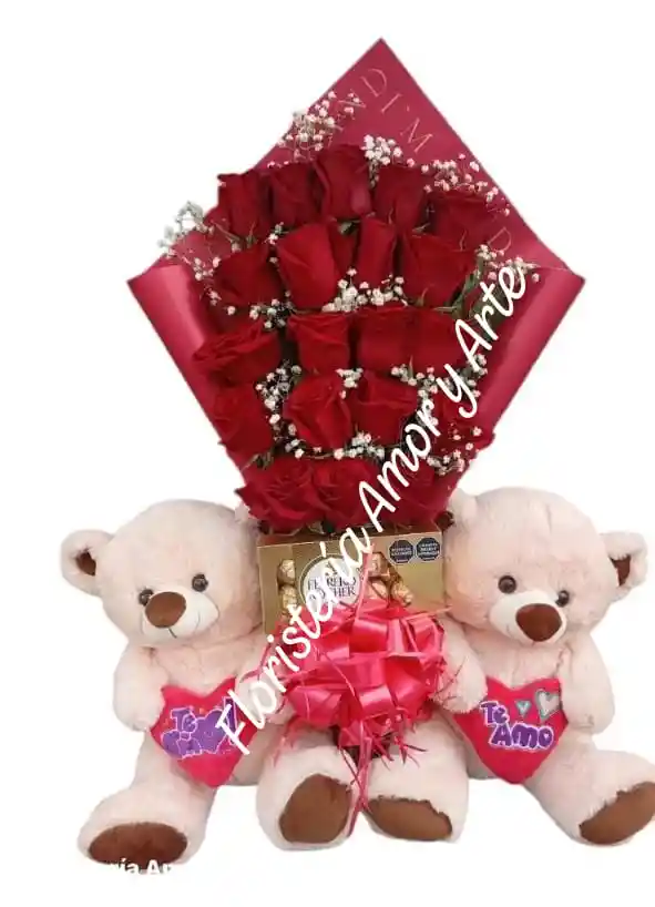 HERMOSO BOUQUETS ELABORADO CON 2 DOCENAS DE ROSAS ROJAS TIPO EXPORTACION Y DOS OSOS DE PELUCHE PEQUEÑOS, DETALLE ORGAZIZADO CON PAPEL COREANO Y MOÑO EN CINTA DE PAPEL