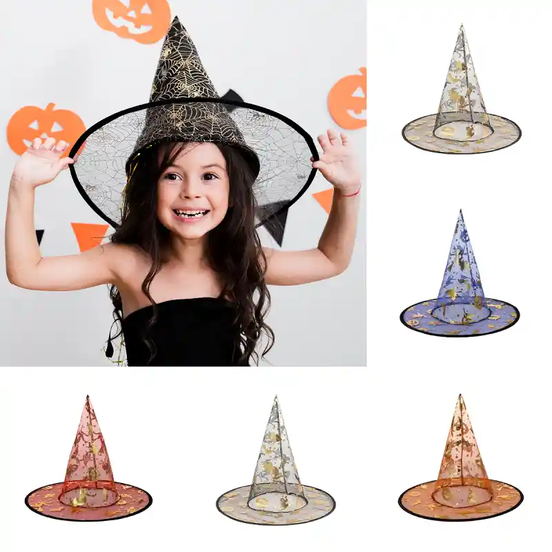 Sombrero Gorro Bruja Disfraz Fiesta Halloween Incluye: 1 unidad Diseño: Transparente con estampado metálico Color: Surtido (variedad de colores como negro, azul, rojo, naranja, blanco) Talla: Única (adultos y niños mayores) Medidas: 38 cm x 32 cm aprox. Material: Ligero y cómodo Perfectos para: - Fiestas de Halloween - Sesiones de fotos - Eventos escolares y temáticos - Decoración o disfraces creativos Combina estos sombreros con capas, vestidos o maquillaje de fantasía y crea un look inolvidable de bruja, hechicera o personaje encantado.