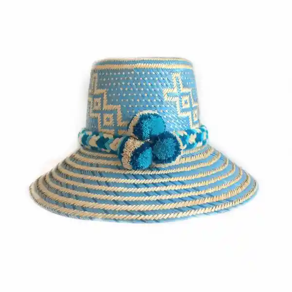 SW058 Sombrero wayuu tejido en hoja de palma con trenza y 3 pompones