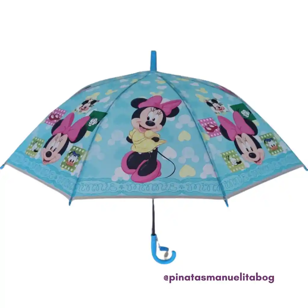 Sombrilla plástica en color azul con estampado de Minnie, incluye un pito sencillo en la manija de la sombrilla, tiene una medida 66 cm.